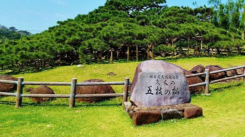 是日本國家指定天然紀念物,是1839年種植的琉球松,它的枝幹和一般樹木不同,並不是向上攀緣,而是朝地面延伸,特殊的生長方式讓這樹齡300年的五枝松更顯壯觀。