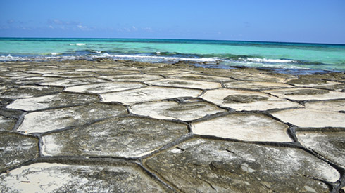 熔岩在冷卻時由於柱狀節理這種珍奇現象,形成了直徑1~2m的五角形・六角形平坦的石塊像龜甲似的整齊地排列著。該疊石為沖繩縣政府認定的保育類自然景觀,宛如烏龜甲殼般的岩石鋪展在海岸上。