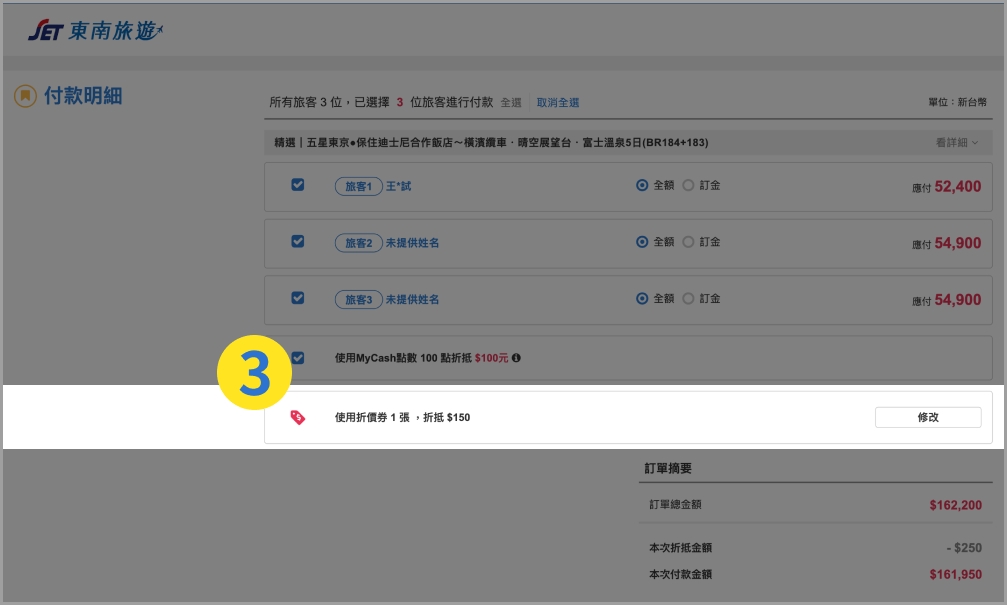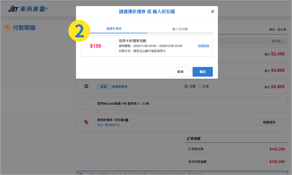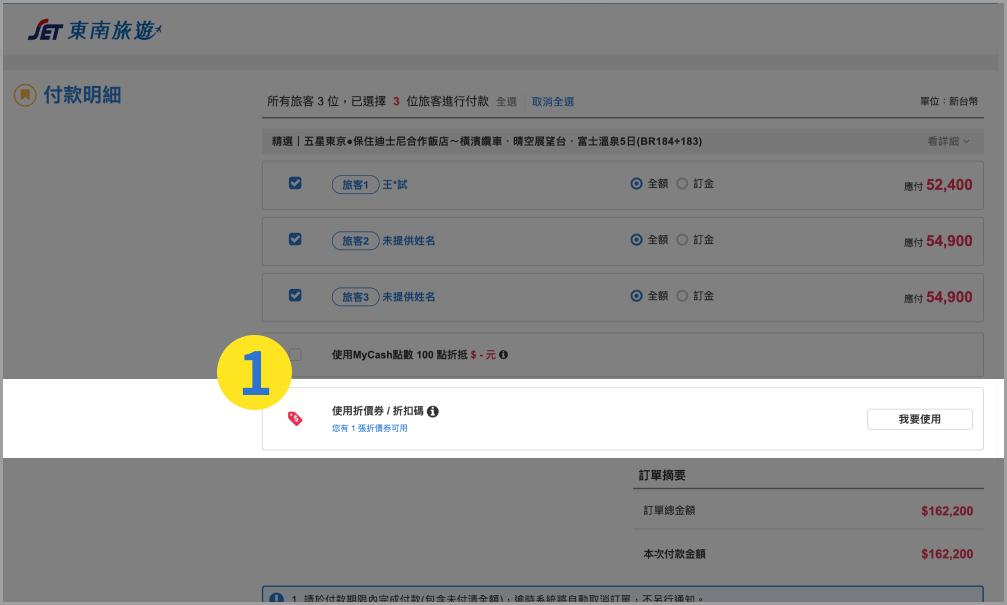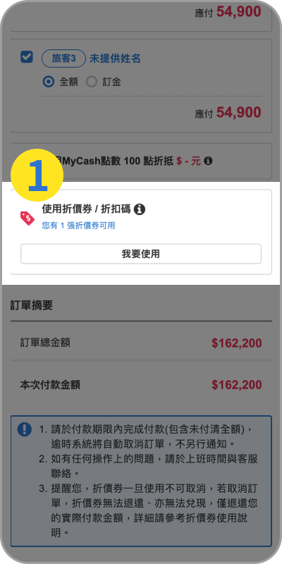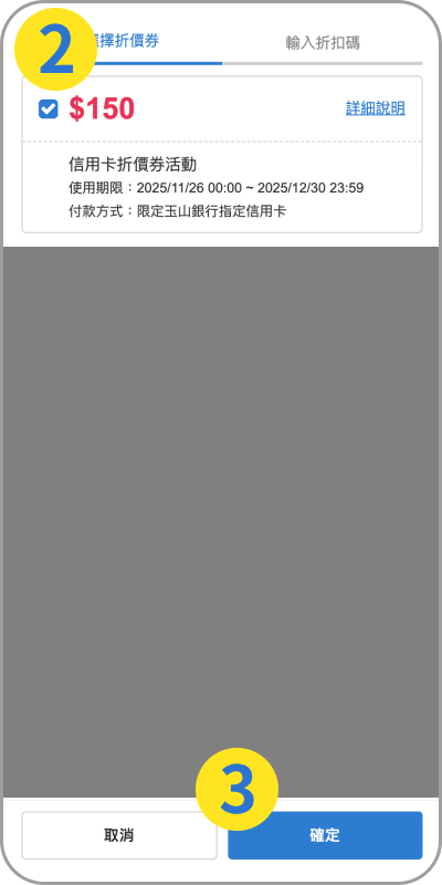 登入會員,成立訂單後到付款頁面選擇要使用折價券