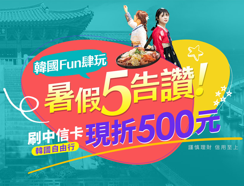 - 活動期間刷中國信託信用卡購買韓國機加酒自由配,輸入折扣碼KOR500, 即享現折500元。