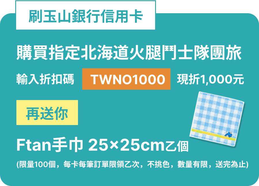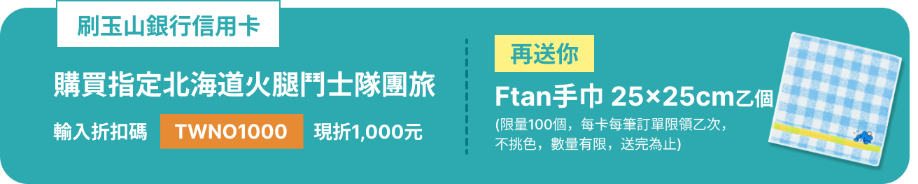 活動期間下單刷玉山銀行信用卡購買指定北海道日本火腿鬥士隊活動團旅,結帳輸入折扣碼TWNO1000,即可享玉山指定團旅行程現折1000元,限每會員每筆訂單現折乙次。