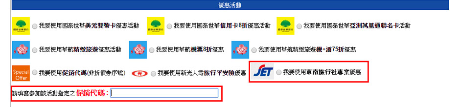 請於付款預覽頁面上,在”我要使用東南旅行社專案優惠”,輸入【專案促銷代碼】