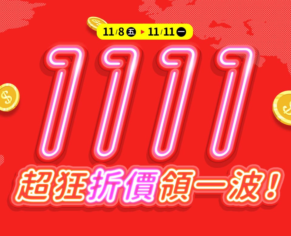 - 活動期間2019/11/8 - 2019/11/11共4日開放領取,限量1111張,領完為止。