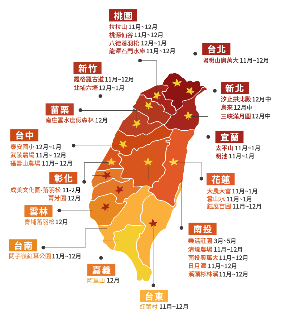 秋意濃!賞楓季節到來了!秋天留在台灣好好賞楓吧!網友票選台灣賞楓熱點大公開,陽明山、奧萬大、杉林溪、阿里山通通在榜上,究竟這些地區最佳賞楓時間是哪時候呢?除了這幾個景點,還有哪些賞楓熱點呢?