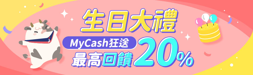 會員於生日當月訂購商品,第一筆消費自動享有最高20% MyCash回饋!