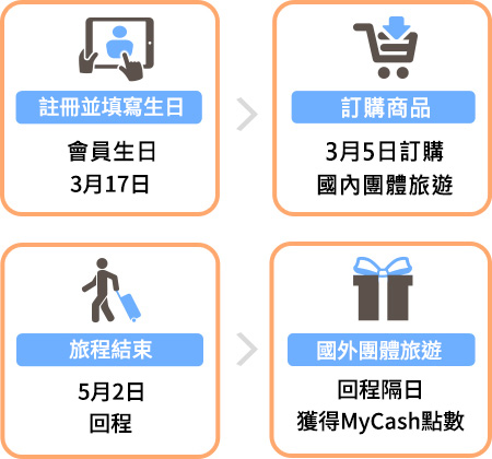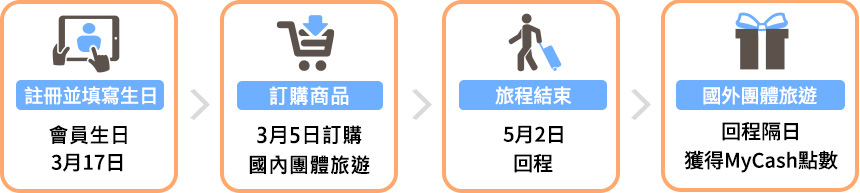 哞寶在東南旅遊網站註冊成為一般會員,填寫生日為3月17日,即於每年的3月1日起至當月最後一日23:59前,第一筆訂單即享有生日禮資格;哞寶於3月5日訂購國外團體旅遊,5月2日回程,訂單金額6,000元,本筆訂單為哞寶當月的第一筆訂單,且於生日當月訂購,即享有生日禮資格,因此哞寶於回程後隔日,5月3日將獲得消費金額5%的MyCash回饋300點。