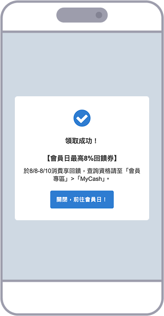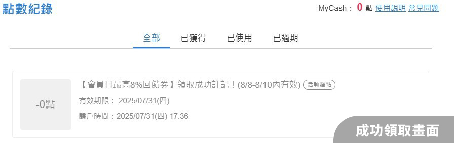 - 可至【首頁右上角-會員專區】>【MyCash】查詢,系統會顯示「【會員日最高8%回饋券】領取成功註記!」作為成功領取之紀錄。
