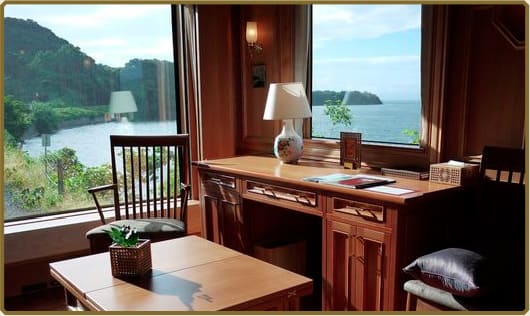 就在列車的盡頭,推開那個像藝術品般的手工鐵鑄雕花門後就進入唯一一間在七星列車裡最高級的701-Deluxe Suite套房,房間超級寬敞以外就是沙發區有個超大觀景窗,可以在列車行進中,完整眺望九州美麗風景。