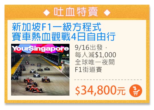 【5/2前付訂‧每人省1000】2016 新加坡F1一級方程式賽車熱血觀戰4日自由行