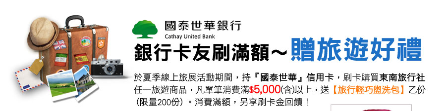 - 2.於活動期間(2015/05/04~2015/05/31),限刷國泰世華銀行信用卡且於東南旅行社完成交易,凡符合贈獎門檻即可申請滿額加碼禮,贈獎門檻的審核依據,以單次刷卡消費金額為主(分期同享),每人每卡限領乙份,活動贈品均以實物為準(不得要求折換現金/其他物品或旅遊商品),限量200份,送完為止。