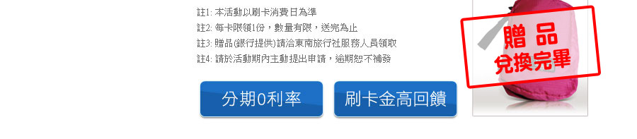 - 1.贈品【旅行組輕巧盥洗包】請於活動期間內主動洽東南旅行社服務人員申請(逾期申請,恕不補發),待活動結束後統一發送,贈品請向負責服務人員領取。
