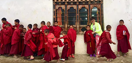 與高僧住持交流,接受加持祝福,飲用不丹酥油茶。漫步院中,與天真無邪的寺院小和尚互動留影,言語間,聊繪出是一種簡單、平靜的幸福。
