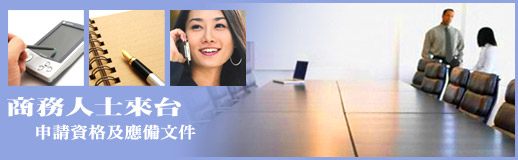 - 依實際入台日期申請,從事商務訪問、商務考察、商務會議、演講、參加商展及參觀商展者,其停留期間不得逾十四日。
