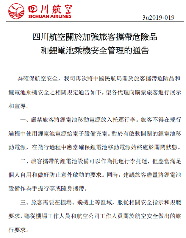 四川航空-旅客攜帶危險品和鋰電池乘機安全管理的通告