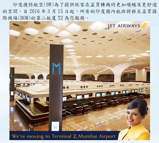 印度捷達航空-3/15起在孟買轉搭印度國內線航班將於第二航廈為您服務