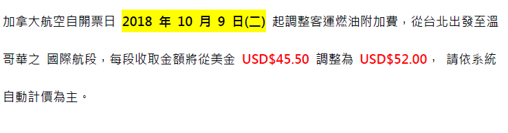 加拿大航空-加拿大航空調整客運燃油附加費通知