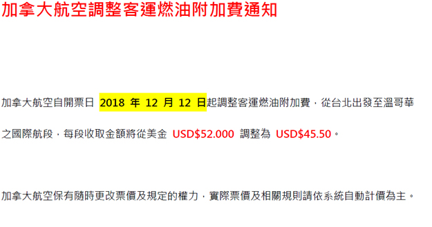 加拿大航空-加拿大航空調整客運燃油附加費通知