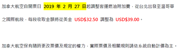 加拿大航空-加拿大航空調整客運燃油附加費通知