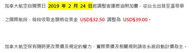 加拿大航空-調漲客運燃油附加費通知