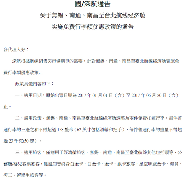 關于無锡、南通、南昌至台北航線經濟艙實施免费行李额優惠政策的通告