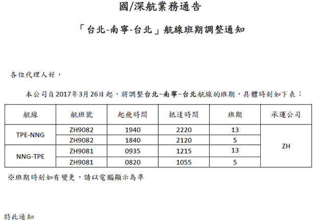中國國際航空-「台北-南寧-台北」航線班期調整通知