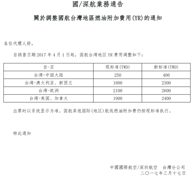 中國國際航空-關於調整國航台灣地區燃油附加費用(YR)的通知