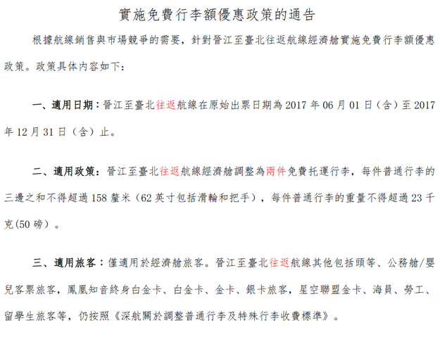 中國國際航空-關於晉江至臺北往返航線經濟艙實施免費行李額優惠政策的通告