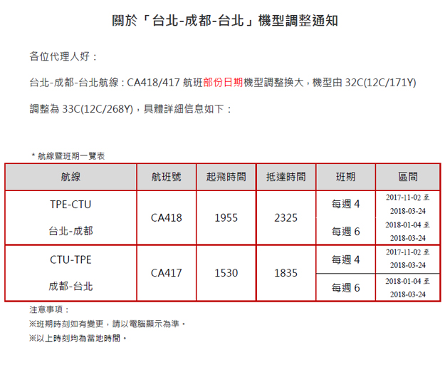 中國國際航空-關於「台北-成都-台北」機型調整通知