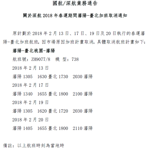 中國國際航空-關於深航2018年春運期間瀋陽-臺北加班取消通知