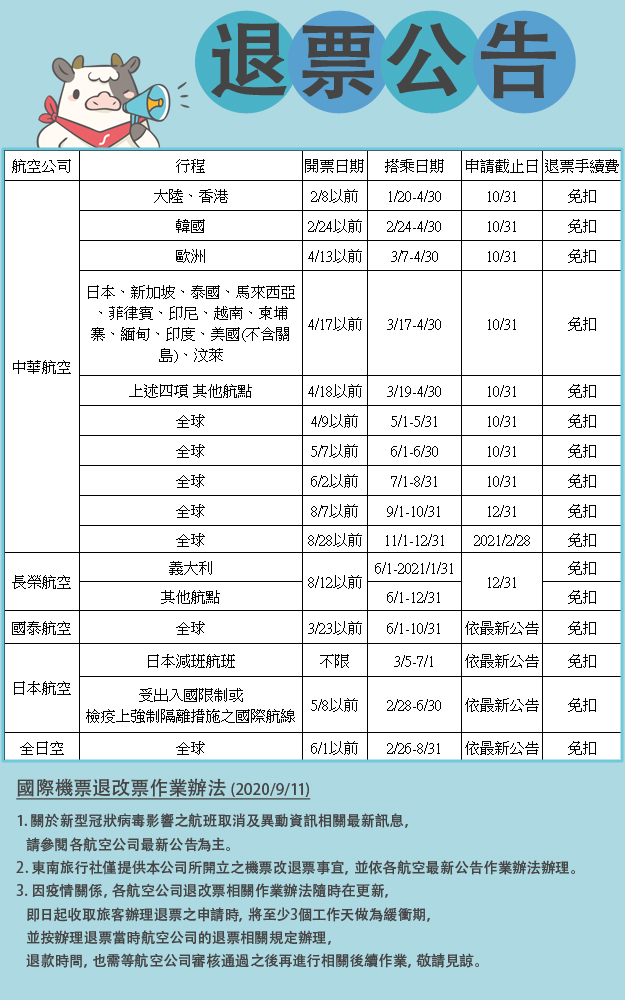 最新退票辦法 請洽東南旅遊票務部客服電話