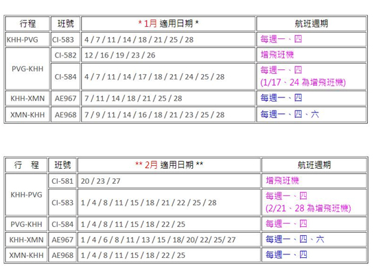 中華航空-2021 1-2 月份高雄-上海、廈門航班