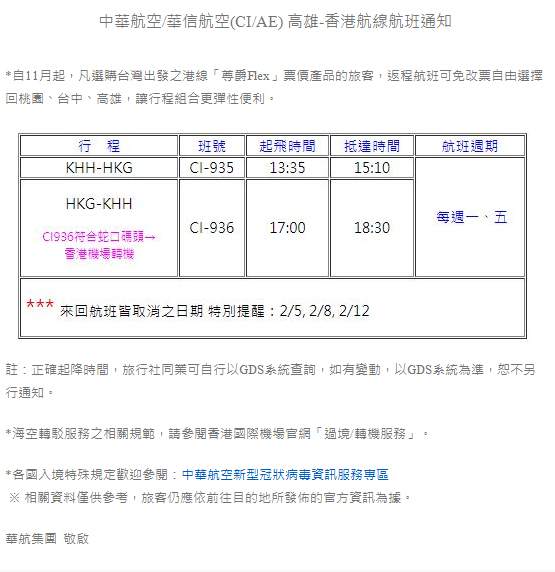 中華航空-高雄香港航線航班通知