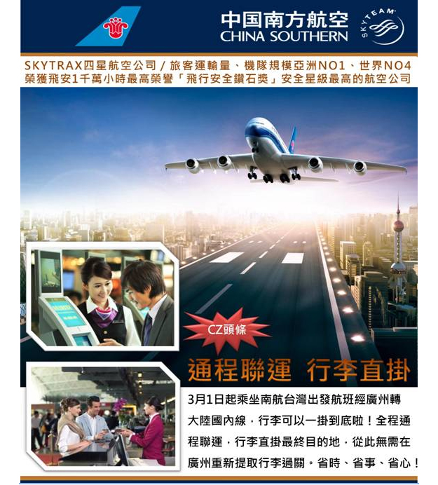 自2017年3月1日起,乘坐南航台灣出發航班經廣州中轉的旅客