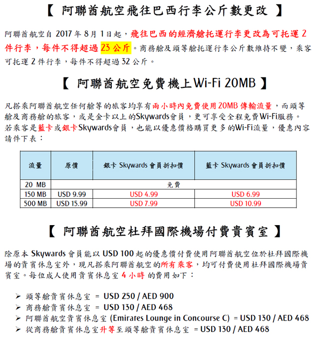 阿聯酋國際航空-飛往巴西行李、機上Wifi、貴賓室相關訊息