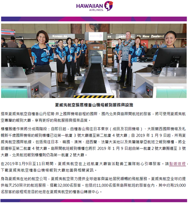 夏威夷航空-日本 夏威夷機場櫃檯搬遷