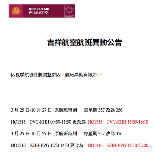 上海吉祥航空-高雄航班異動公告(更新)