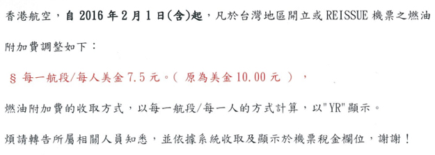 香港航空-調降燃油附加費通告