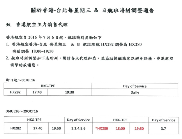 香港航空-關於香港-台北每星期 三 & 日HX282航班時刻調整通告