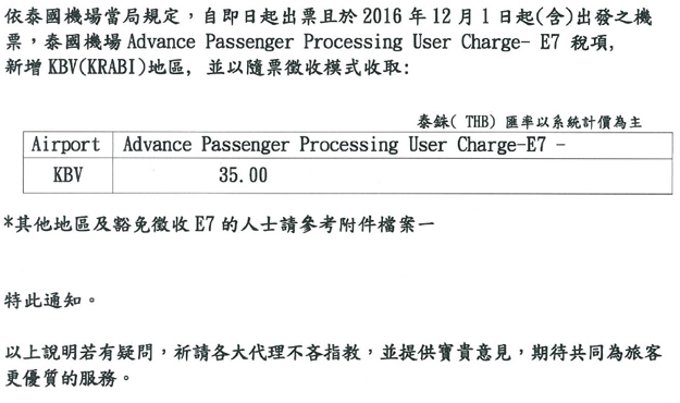 香港航空-泰國機場E7 稅項新增KBV(KRABI)地區, 並以隨票徵收模式收取