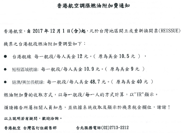 香港航空-調漲燃油附加費通告(生效日期01Dec2017)