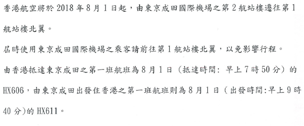 香港航空-東京成田國際機場航站 由第二航站搬遷至 第一航站北翼