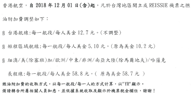 香港航空-調整燃油附加費通告