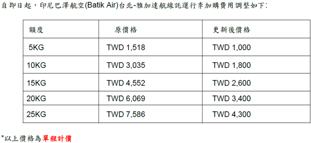 巴澤航空-台北雅加達航線加購託運行李