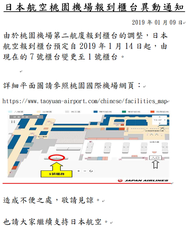 日本航空-日本航空桃園機場報到櫃台異動通知