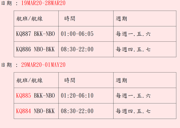 肯亞航空-曼谷-奈洛比航班異動