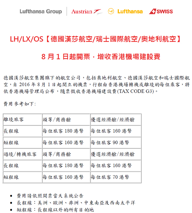 德國漢莎航空-8/1日起開票,增收香港機場建設費