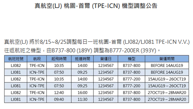 真航空-桃園-首爾 (TPE-ICN) 往返航班之機型