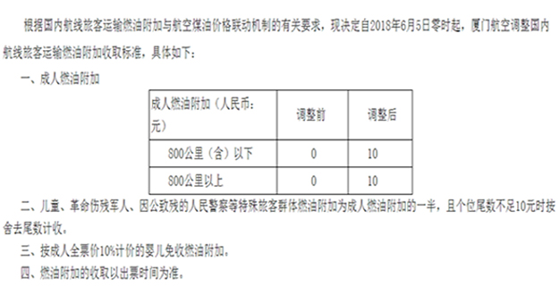 廈門航空-關於調整國內航線旅客運輸燃油附加收取標準的通告
