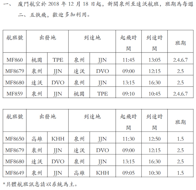 廈門航空-泉州(JJN)-達沃(DVO) 航班通告