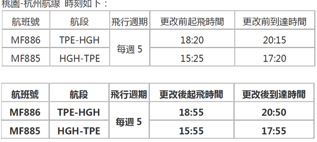 廈門航空-2019年12月20日起桃園杭州時刻異動